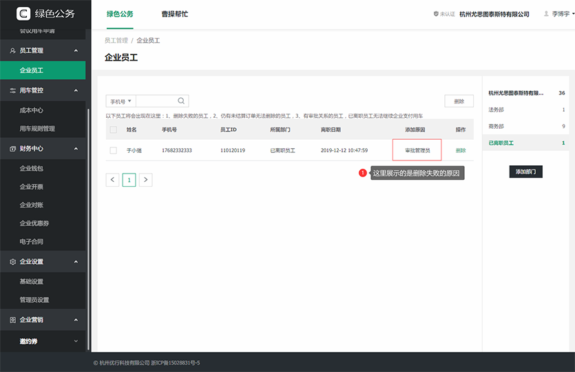 信息摘要:当各位管理员在操作删除员工时,如果遇到员工是某个审批用车的管理员,或者该员工有未完成的订单,我们的删除操作将无法成功,这时被删除失败的员工会进入“已离职员工列表”。如下图所示:此时如果需要将员工从“已离职员工”名单恢复的话,需要根据删除失败的原因进行解决,当对应的删除失败问题解决后,即可将该员工从“